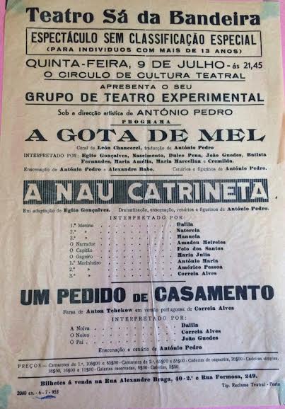 O dia 18 de Junho 1953, no teatro SA da BANDEIRA, foi o nosso dia de glòria. Fizemos um triunfo O PORTO, cidade històricamente levada à contestação da ordem estabelecida, pelas armas se necessàrio, esperava com curiosidade. Esta troupe d’amadores principalmente composta de gente da oposição polìtica, de intelectuais, de artistas passados pela prisão para uns três ou quatro de entre eles, atrevia-se a apresentar três peças curtas, « A gota de mel » do Leon CHANCEREL, « A Nau Catrineta » do poeta E. Gonçalves, e « Um pedido de casamento » d’ A. Tchekov. Eu aparecia como a segunda Menina na « Nau Catrineta », e que trabalho dei às costureiras para disfarçar uma gravidez de cinco meses !